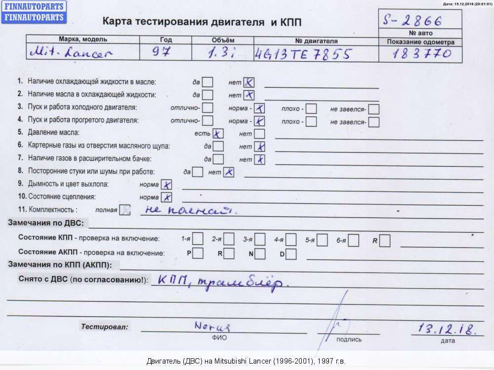 | Нижний Тагил | 2005 | MN187377, 2005, 2л, Бензин, Инжектор, 4G94, *4G94QT4784 (4G94Q14784), MN187377, Седан, белый, Фото не актуально, с запчасти отделены: Генератор, Насос гидроусилителя руля (ГУР), Компрессор кондиционера, Заслонка дроссельная, Форсунка топливная, Катушка зажигания, Катушка зажигания, *4G94QT4784 (4G94Q14784) | - , эмульсия - нет, состояние ГРМ - нормально, поддон - нормально, клапанная крышка - нормально, сломана катушка зажигания, резерв Кострома до 18.01.2021, | |||